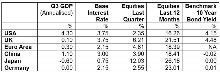 GDP Data shown are to the 30th of September 2025; Interest Rate, Equity & Sovereign Benchmark Bond Yield Data are to the 31st of December 2025; Equity Indices used: US – S&P 500, UK – FTSE 100, Eurozone – Euro Stoxx 50, China – Shanghai Shenzhen CSI 300, Japan – Nikkei 225, Germany – Xetra Dax; Benchmark Sovereign Bond Yield Data courtesy of Trading Economics.